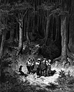 La nuit vint, et il s'éleva un grand vent qui leur faisait des peurs épouvantables. Ils croyaient n'entendre de tous côtés que des hurlements de loups qui venaient à eux pour les manger. Ils n'osaient presque se parler ni tourner la tê